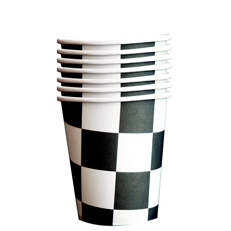 La decoración temática puede transformar una celebración ordinaria en una experiencia inolvidable. Estos vasos de papel con diseño de bandera a cuadros son el complemento perfecto para cumpleaños infantiles, fiestas de automóviles o celebraciones temáticas con motivo de carreras. El característico patrón en blanco y negro de la bandera de carreras inmediatamente crea una atmósfera de velocidad y diversión.