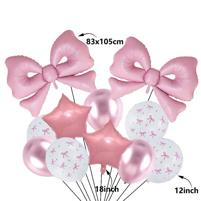 Los globos de látex tienen un diámetro de 30,4 cm (12 pulgadas) y su mezcla rosa y blanca crea una armoniosa combinación de colores. Las estrellas de foil tienen un tamaño de 45,7 cm (18 pulgadas) y el elemento dominante de todo el juego es un gran globo de foil en forma de moño de tamaño 83 × 105 cm. Este elemento destacado le da a toda la decoración un aspecto original y estiloso.