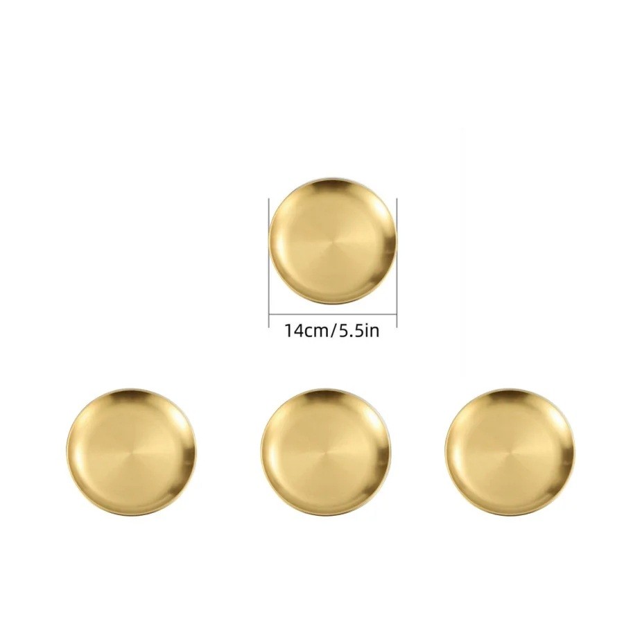 Elegantes platos dorados de acero inoxidable son ideales para servir postres, aperitivos y pequeños bocados en la mesa. Descripción completa