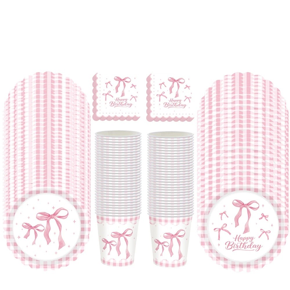Gracias a la combinación completa de platos, vasos y servilletas, podrás crear fácilmente una decoración de fiesta uniforme sin necesidad de elegir individualmente los complementos. El diseño de los lazos es tanto adorable como elegante, lo que convierte a este set en la decoración ideal para cumpleaños, celebraciones infantiles o fiestas familiares.