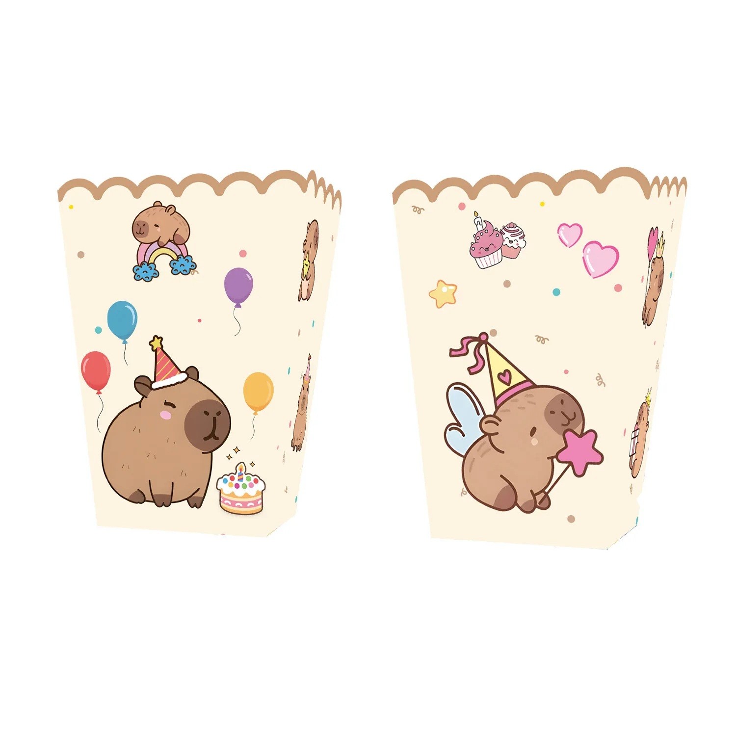 Las cajas de papel para palomitas con el diseño de Kapybara y gorro de cumpleaños son ideales para golosinas y aperitivos en una fiesta infantil. Descripción completa