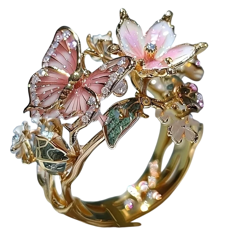 Elegante anillo romántico decorado con una mariposa y flores con brillantes piedras. El diseño ajustable garantiza un uso cómodo. Descripción completa