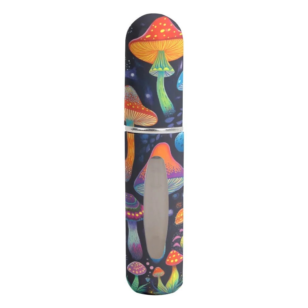 La apariencia del atomizador destaca por su fondo negro con llamativas ilustraciones de setas, que le otorgan un carácter único al producto. Este diseño es poco convencional y se diferencia de las variantes de un solo color. La combinación de un fondo oscuro y detalles coloridos crea un interesante contraste visual. Así, el atomizador cumple no solo una función práctica, sino también estética.