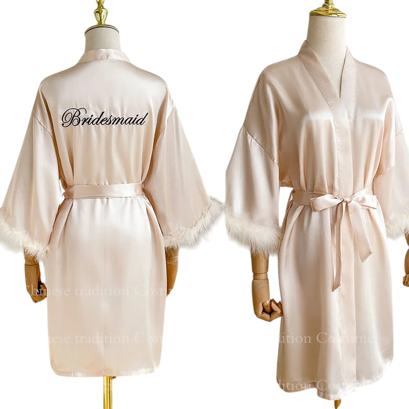 Bata de mujer con borde de felpa en las mangas Texto Bridesmaid Cierre en la cintura Bata ligera de poliéster y seda artificial Bata elegante