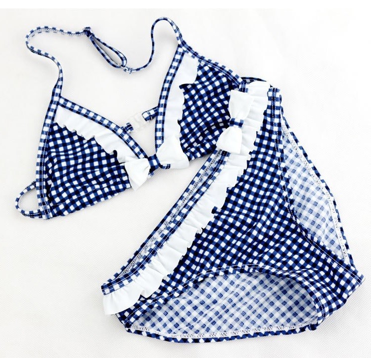 El bañador es de dos piezas y de cuadros con un pequeño lazo en medio de las copas.