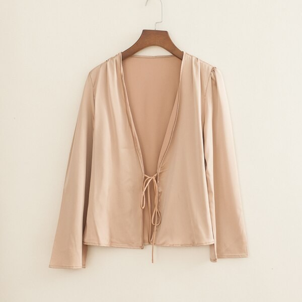 Tiene mangas largas y lazos en el medio.