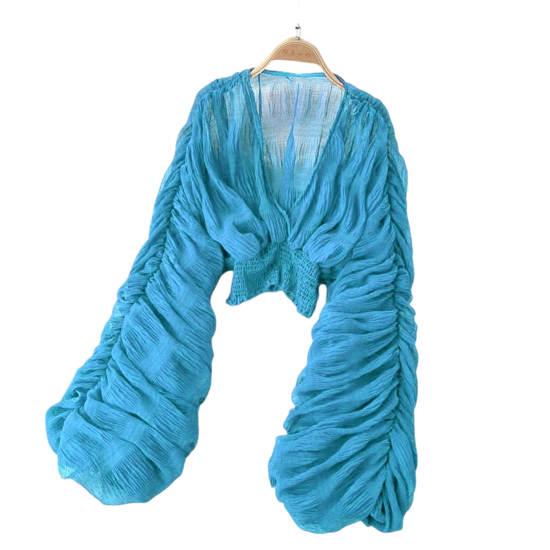 El material semitransparente es aireado y suave, sin perder elegancia. La talla universal está diseñada para adaptarse a diferentes tipos de figura y permitir un uso cómodo sin restricciones de movimiento. El fruncido añade un interesante detalle visual y ayuda a crear una forma favorecedora. La confección en poliéster asegura un fácil mantenimiento, estabilidad de forma y larga durabilidad. Este modelo es la elección ideal para mujeres que buscan una prenda estilosa pero práctica.