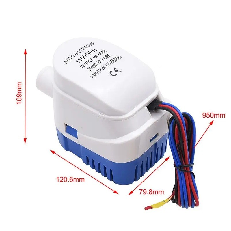 Potente bomba automática de 12V con un caudal de 1100GPH y salida de 29 mm garantiza un drenaje confiable de agua de barcos, yates y casas flotantes. Descripción completa