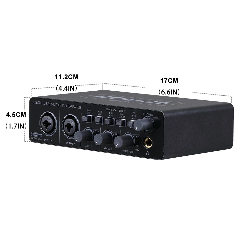 BOMGE U202 Interfaz de audio USB 17 x 11,2 x 4,5 cm Tarjeta de sonido externa profesional con entrada dual XLR + 6,35 mm y alimentación phantom de 48V