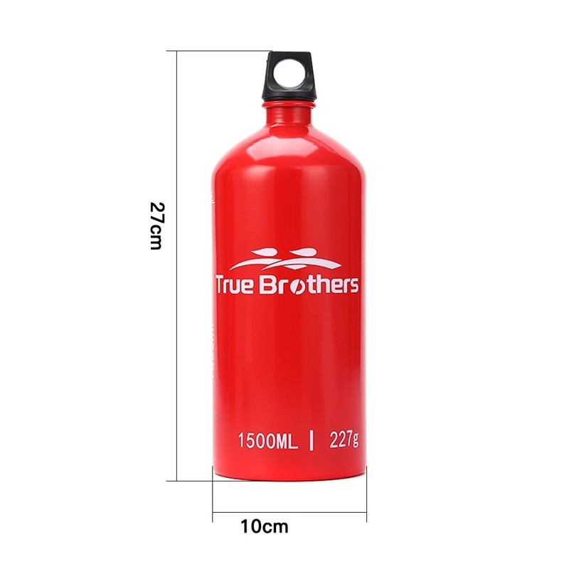 Botella de combustible resistente para estufas de camping con gran capacidad de 1,5 l. Ligera construcción de aluminio y plástico adecuada para senderismo. Descripción completa
