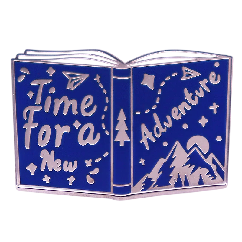 El broche metálico en forma de libro abierto está decorado con el texto „Time for a New Adventure“ y sencillas ilustraciones de montañas, árboles y pequeños símbolos. La combinación de un fondo azul y detalles claros crea un contraste destacado que es fácilmente legible. El motivo tiene un carácter temático y hace referencia a los viajes, el descubrimiento y la relación con los libros. Gracias a su forma, recuerda una página abierta con una ilustración.