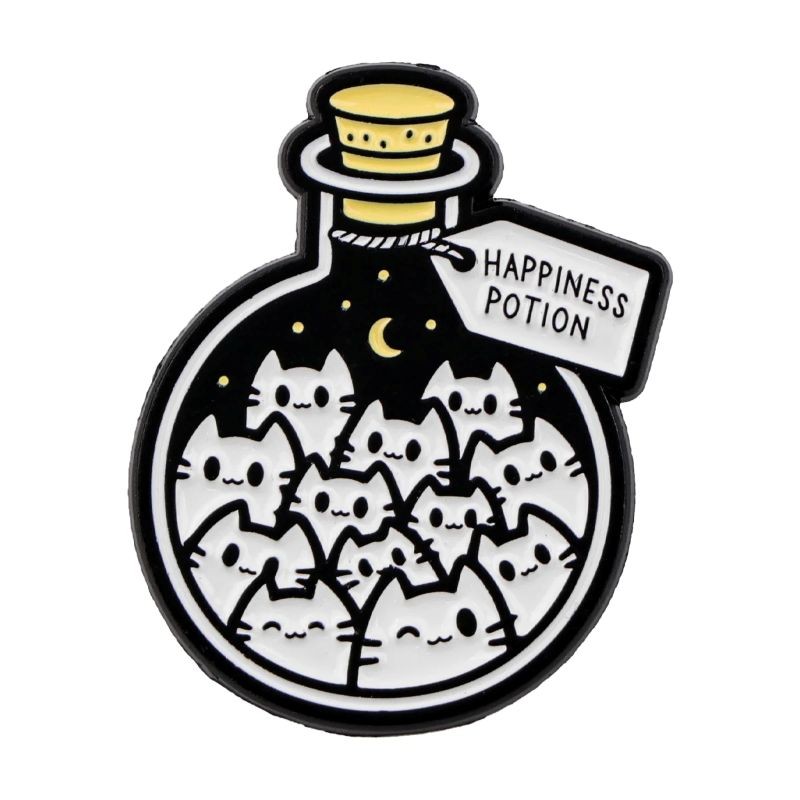 El broche en forma de botella con motivo de gatos representa un complemento original con un diseño lúdico. Dentro de la botella estilizada se muestran pequeños gatos que crean un motivo llamativo y a la vez simple. La parte superior se complementa con una tapa y una etiqueta con texto, lo que añade un detalle interesante al aspecto general. La combinación de colores negro y blanco junto con sutiles elementos de color crea un diseño contrastante y fácilmente reconocible. Gracias a sus dimensiones compactas, el broche es adecuado para uso diario en ropa o complementos.