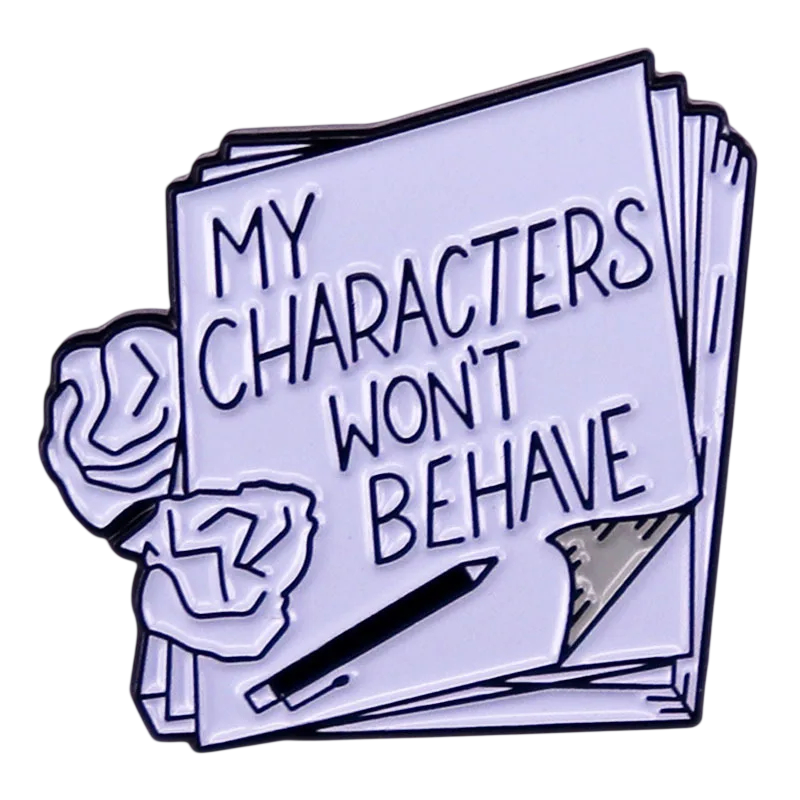 Broche con el texto Mis personajes no se comportarán pin metálico libro con lápiz insignia blanca y azul para ropa mochila accesorio
