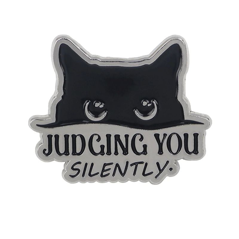 Broche de gato negro con el texto Judging You Silently aproximadamente 3,3 x 3,1 cm pin decorativo con texto para mochila ropa accesorio