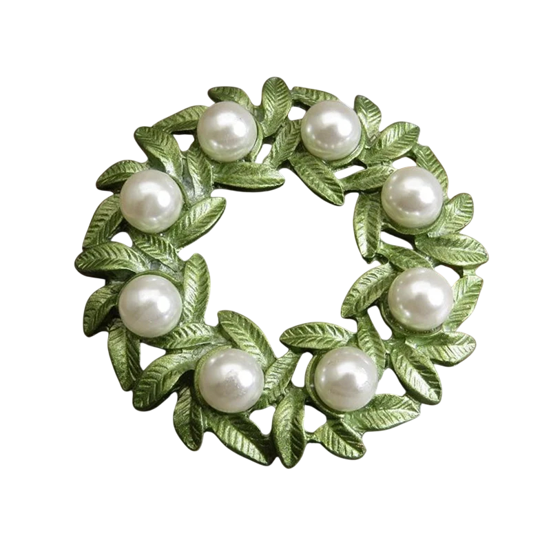 Este lujoso broche en forma de corona destaca por su armoniosa combinación de hojas verdes y perlas blancas, que crea un conjunto elegante y equilibrado. Su diseño discreto resulta sutil y de buen gusto, sin ser demasiado llamativo. El broche está diseñado para complementar fácilmente tanto atuendos formales como informales. El motivo natural le da al accesorio un carácter atemporal. Es una elección ideal para mujeres que prefieren detalles sofisticados.