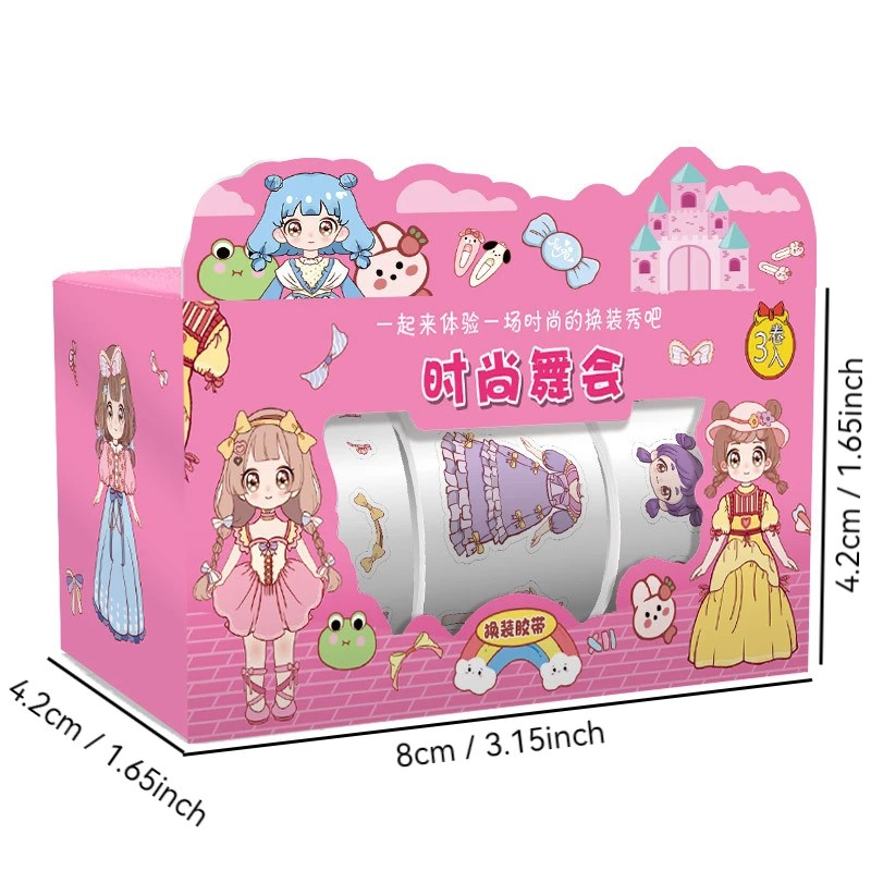 Caja con cintas adhesivas adorables 4,2 x 4,2 x 8 cm Muñeca con ropa y accesorios, pegatinas para papel y pared, peinados, ropa, accesorios
