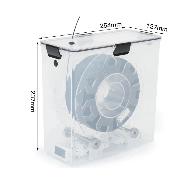 La caja de secado para filamento es una solución práctica para cualquiera que quiera proteger el filamento de impresión de la humedad y al mismo tiempo asegurar su desenrollado fluido durante la impresión 3D. La caja tiene un diseño completamente transparente, por lo que se puede verificar visualmente el estado de la bobina y la cantidad de material restante en cualquier momento. Las dimensiones externas de la caja son 254 x 127 x 237 mm, y en su interior hay espacio para bobinas con un diámetro máximo de 210 mm y un grosor máximo de 79 mm. La tapa está equipada con un sellado y cierres firmes que hacen que la caja esté bien sellada y sea más resistente a la humedad del entorno.