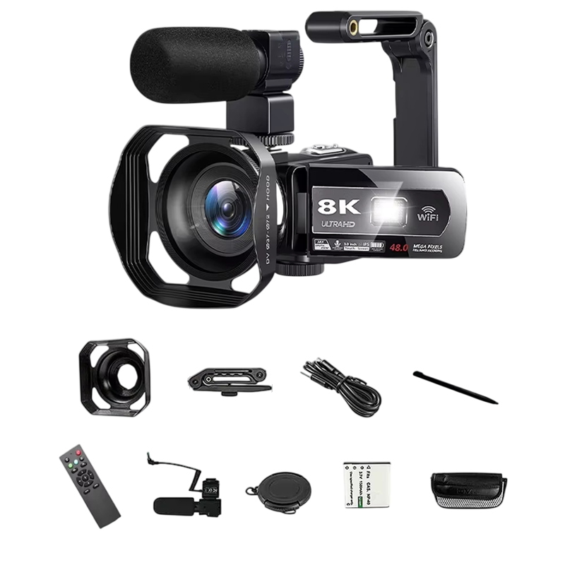 Cámara manual potente con video 8K, pantalla táctil, transmisión Wi-Fi y soporte para micrófono externo para video y fotografía. Descripción completa