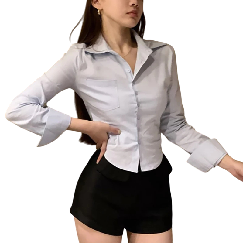 Camisa de mujer elegante de manga larga Blusa de un solo color con cuello y bolsillo en el pecho Cierre de botones Top ligero de poliéster