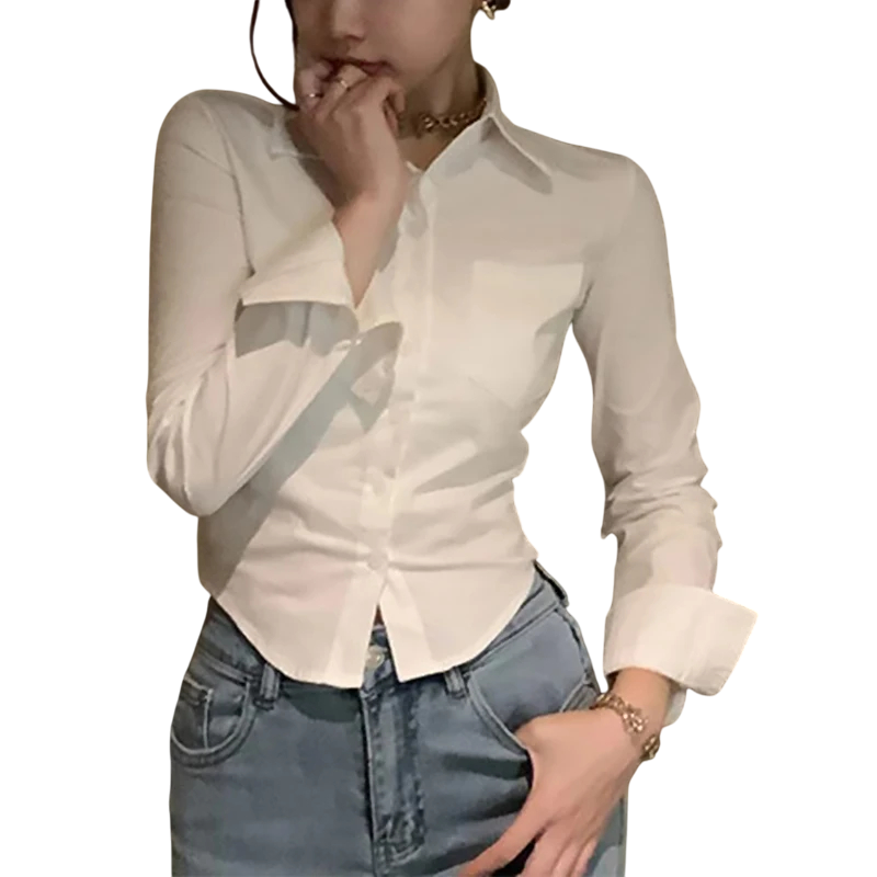 Página de inicio Página de inicio Ropa y accesorios Ropa de mujer Camisas de mujer Camisas formales de mujer Camisa de mujer elegante de manga larga Blusa de un solo color con cuello y bolsillo en el pecho Cierre de botones Top ligero de poliéster