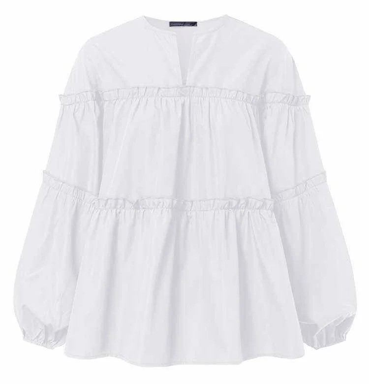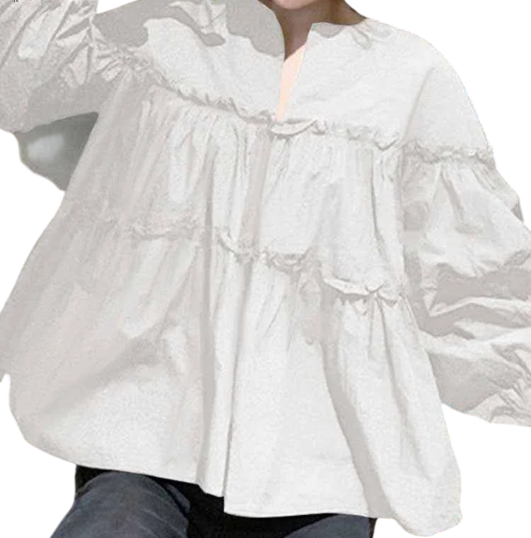 Camisa de mujer holgada de manga larga Blusa elegante con volantes pronunciados Corte ligero y aireado Algodón Poliéster Top de moda para uso diario