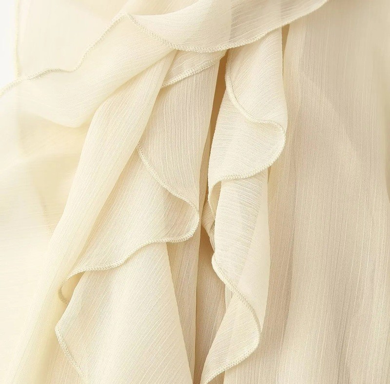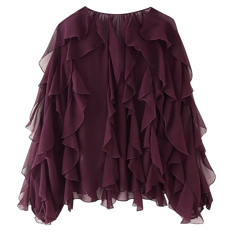 Blusa femenina elegante con volantes y escote en V destaca por su delicada transparencia y poliéster ligero. Una prenda estilosa para cualquier ocasión. Descripción completa