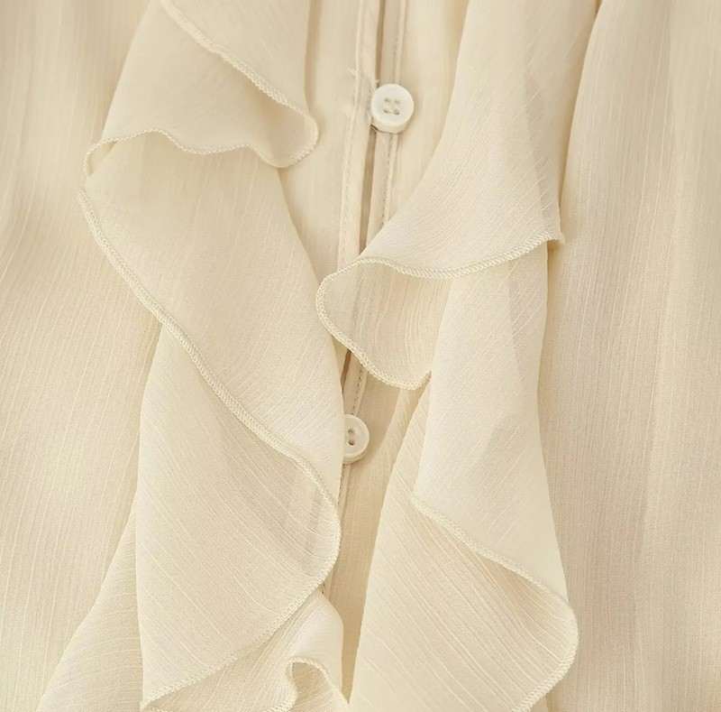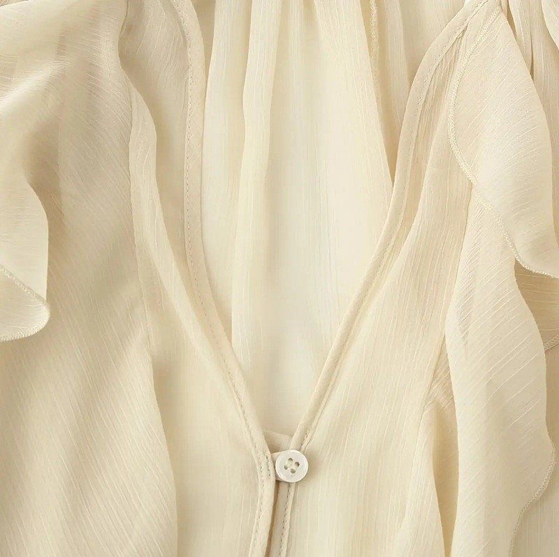 Camisa femenina elegante semitransparente con volantes y escote en V de manga larga con cierre de botones blusa de color sólido de poliéster ligero
