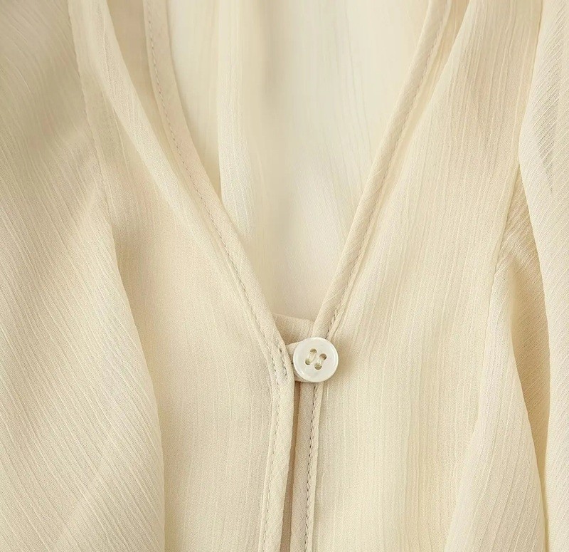 Página de inicio Página de inicio Ropa y accesorios Ropa de mujer Camisas de mujer Camisas casuales de mujer Camisa femenina elegante semitransparente con volantes y escote en V de manga larga con cierre de botones blusa de color sólido de poliéster ligero