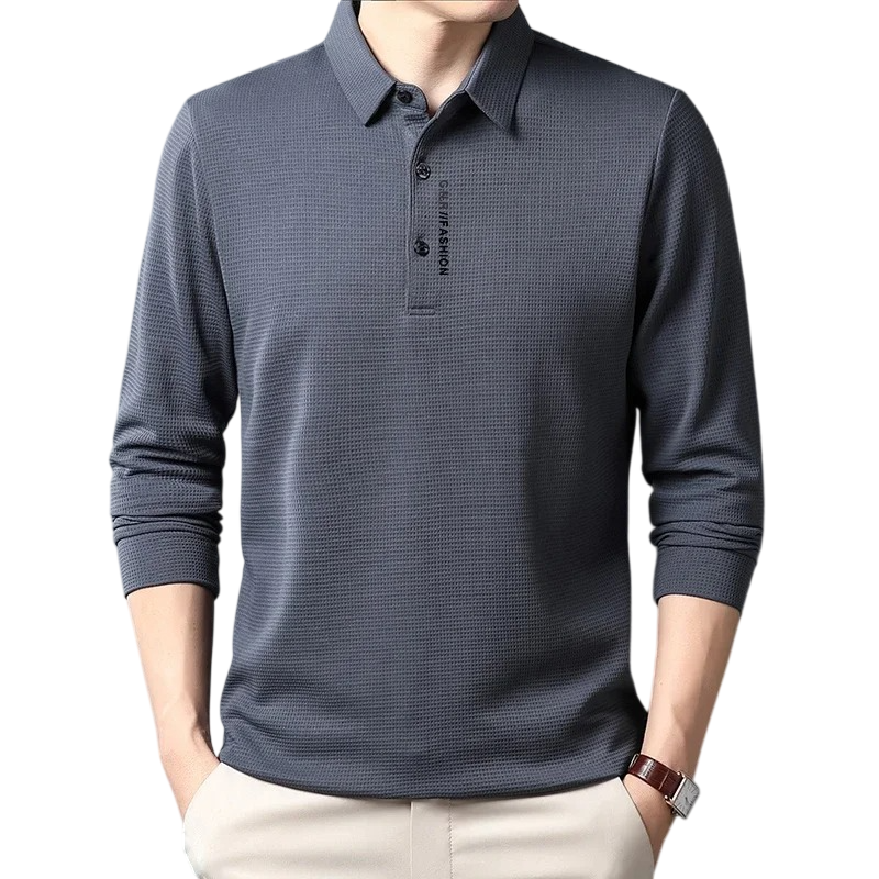 Estilosa camisa polo de hombre de manga larga adecuada para el trabajo y el tiempo libre, material cómodo y aspecto clásico sin estampado. Descripción completa