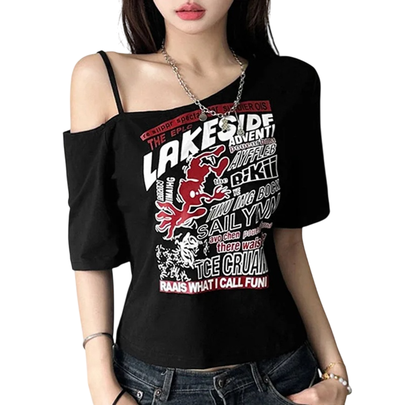 Página de inicio Página de inicio Ropa y accesorios Ropa de mujer Camisetas y tops de mujer Camisetas y tops de manga corta para mujer Camiseta de mujer con hombros descubiertos Corte holgado Estampado elegante Motivo streetwear Top de moda con escote asimétrico Moda casual de verano