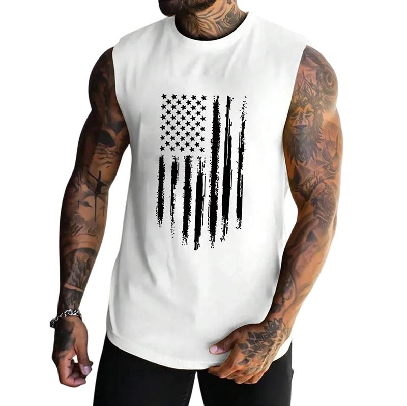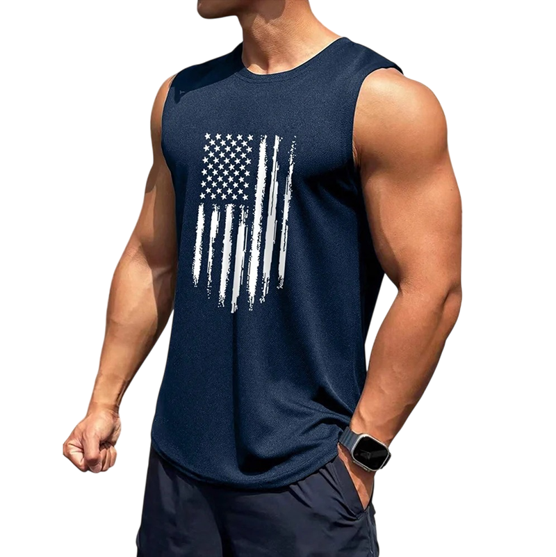 Camiseta sin mangas para hombre de poliéster ligero con diseño de la bandera americana que ofrece comodidad, secado rápido y un aspecto llamativo para el verano. Descripción completa