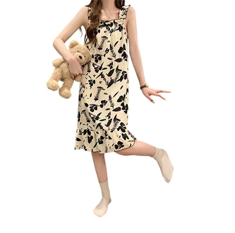 Página de inicio Página de inicio Ropa y accesorios Ropa de mujer Ropa de dormir para mujer Camisones de mujer Camisón de mujer beige con patrones sutiles y volantes Camisón elegante de verano con fruncidos y tirantes anchos Material de poliéster ligero