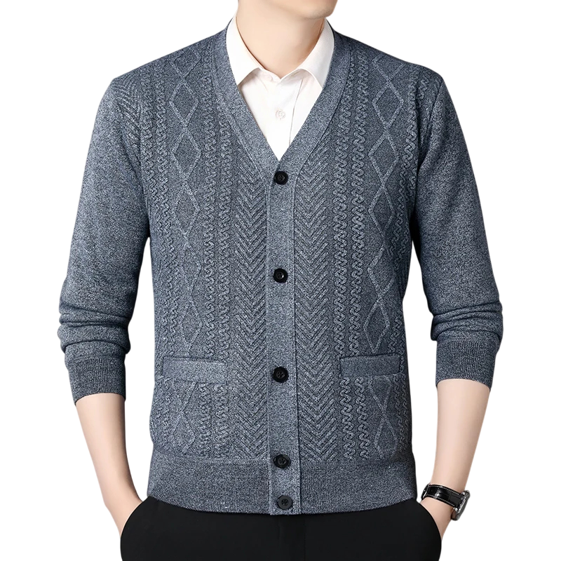 Cárdigan elegante para hombre con cuello en V y cierre de botones. Ideal para ocasiones elegantes o casuales, disponible en varios colores. Descripción completa