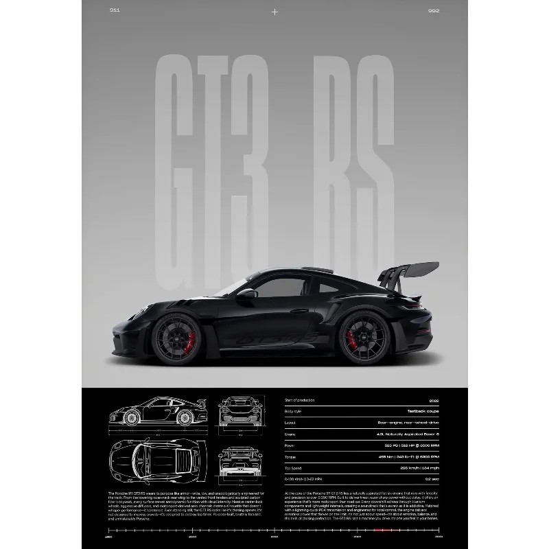 La pieza central es el coche deportivo negro GT3-RS representado de lado, que se sitúa sobre un fondo claro con un texto destacado. La parte inferior del cartel contiene dibujos técnicos y gráficos complementarios que subrayan el carácter técnico del motivo. Este estilo de presentación une la estética y el detalle técnico en una sola imagen.
