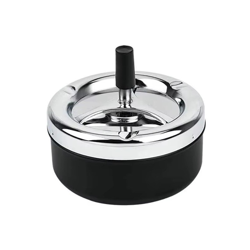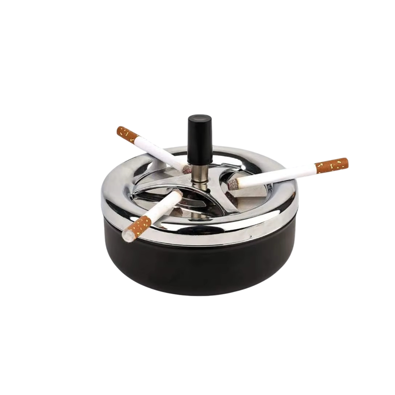 Moderno cenicero giratorio de acero inoxidable con mecanismo autolimpiante y tapa. Un accesorio elegante, práctico y duradero para fumadores. Descripción completa
