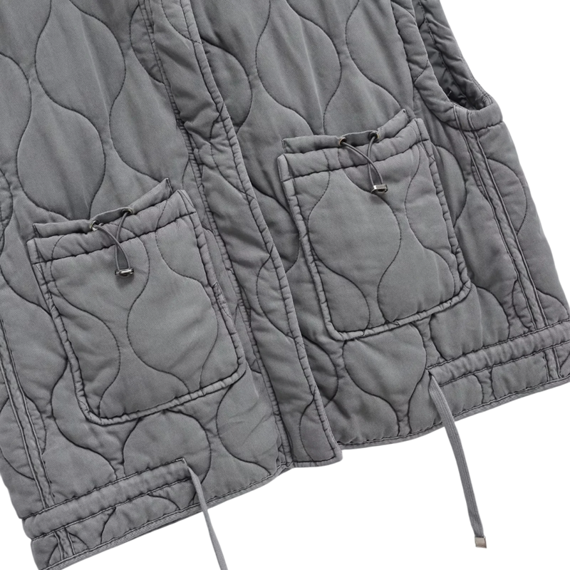 Chaleco de invierno para mujer con cordón en la cintura y bolsillos. Corte cómodo, cierre de botones y elegante diseño gris de poliéster resistente. Descripción completa