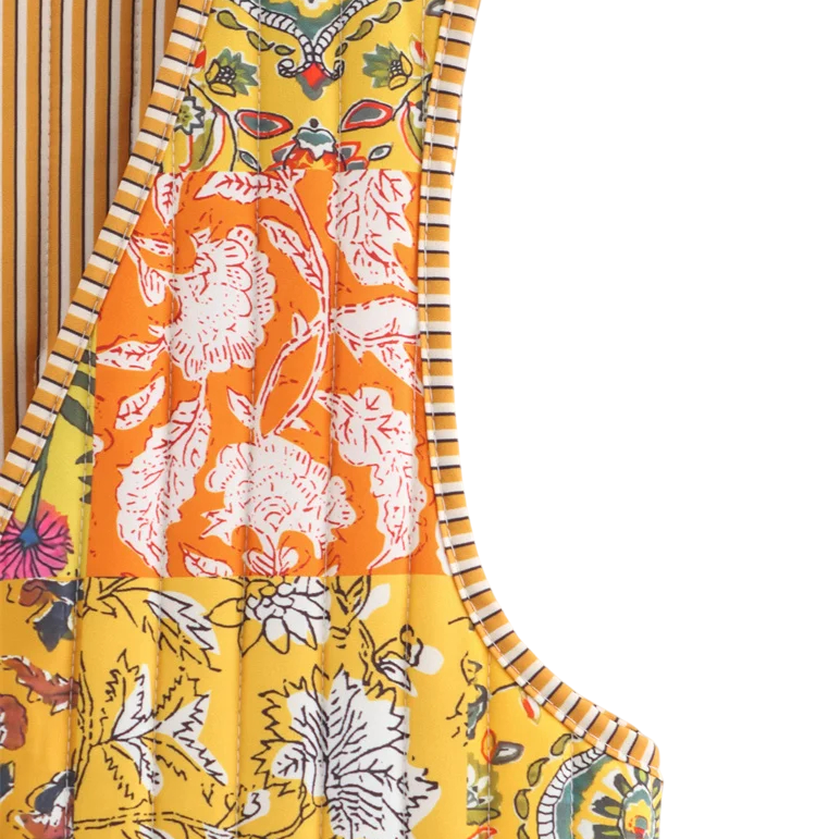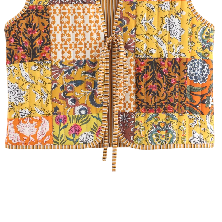 Chaleco femenino ligero con patrones en tonos amarillo-naranja, escote en V y cordón de ajuste. Una prenda elegante, aireada y cómoda. Descripción completa