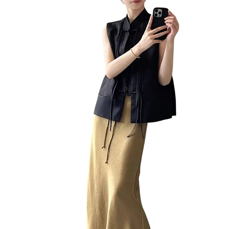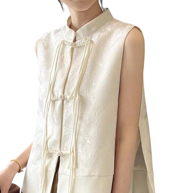 Chaleco jacquard sin mangas para mujer con cuello y cierre de botones