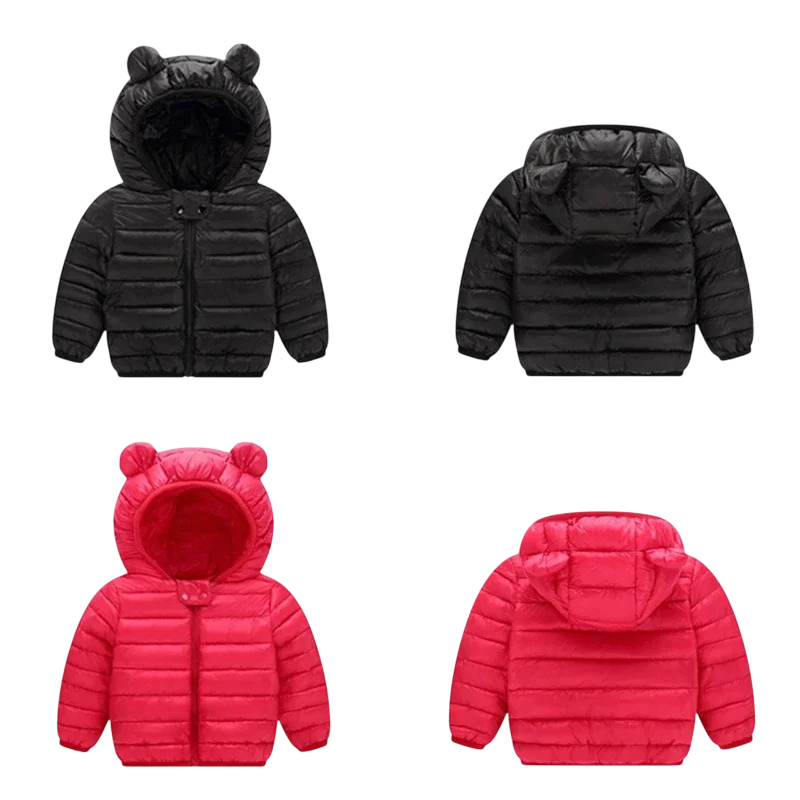 Abrigo de invierno infantil cálido con capucha y orejas y cierre de cremallera. Diseño de poliéster resistente ideal para el uso diario en invierno. Descripción completa