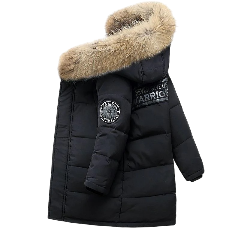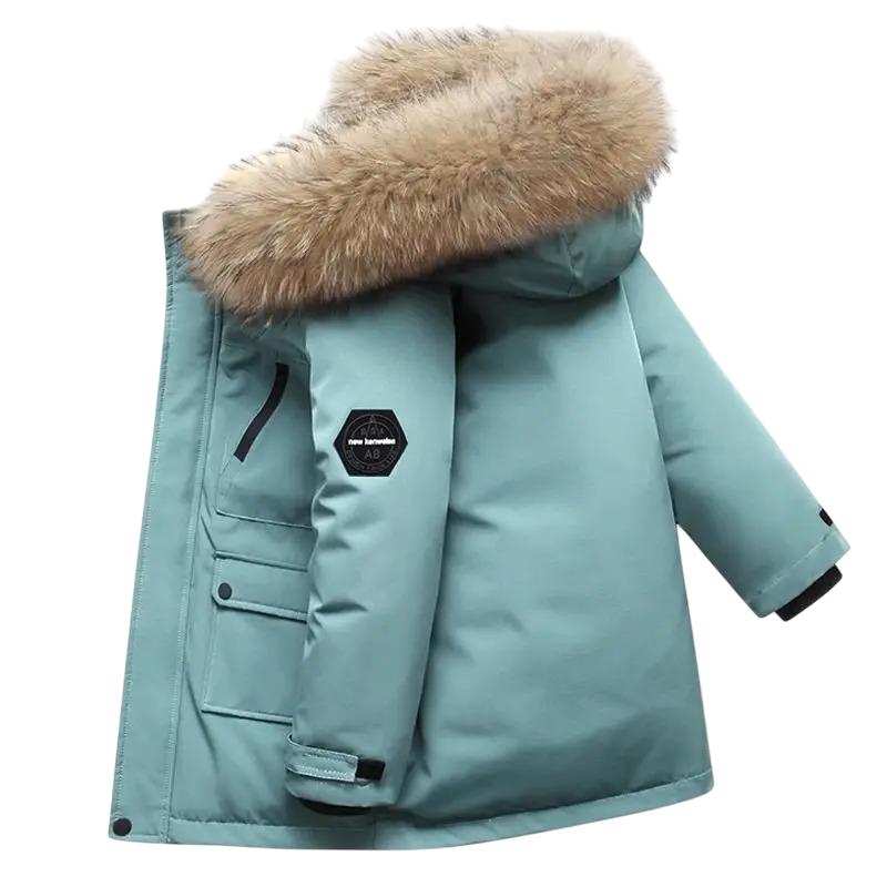 Abrigo de invierno para niños cálido con capucha de pelaje, cierre de cremallera y botones a presión, y prácticos bolsillos. Resistente confección de algodón y poliéster para días de invierno. Descripción completa