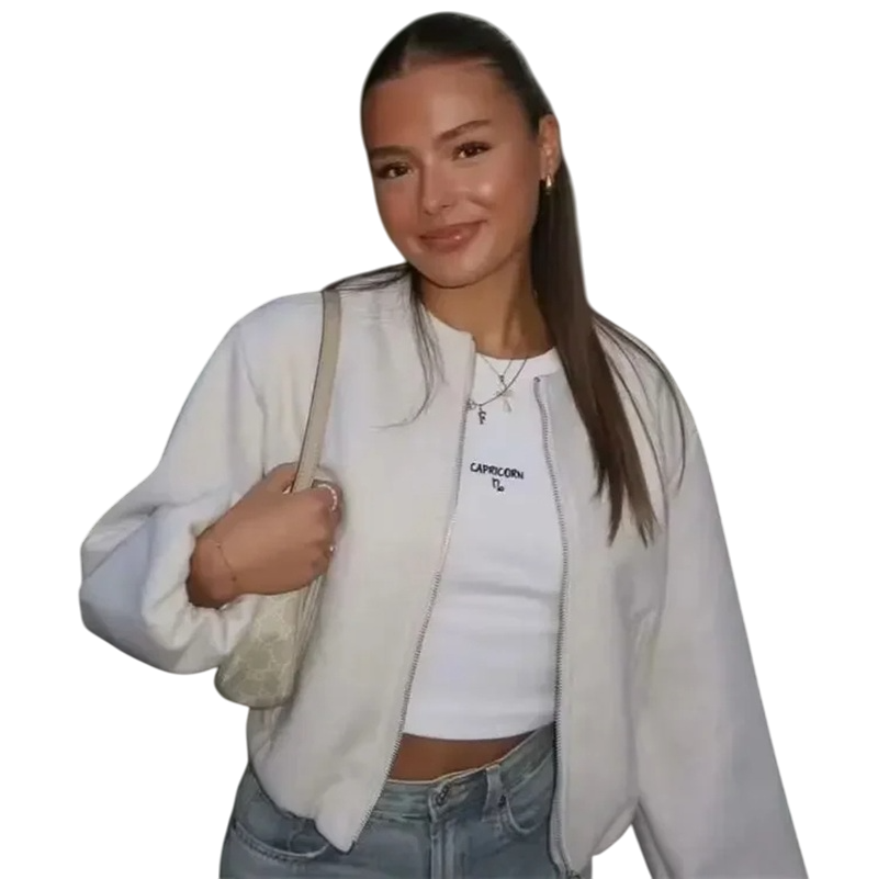 Esta elegante chaqueta de mujer, ideal para los días de otoño, destaca por su estilo sencillo pero elegante. Su corte holgado , con un aspecto relajado y moderno, mantiene un estilo femenino. La cremallera frontal facilita su colocación y adaptación a diferentes temperaturas. Las mangas largas con puños elásticos garantizan comodidad y protegen del viento. Dos prácticos bolsillos delanteros son ideales para abrigarse las manos y guardar objetos pequeños.