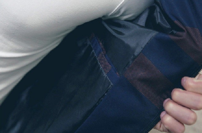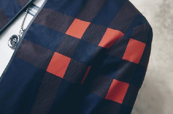 La chaqueta tiene rayas alrededor que se cruzan y forman cuadrados.