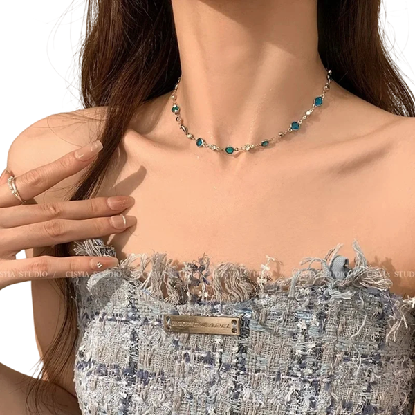 Choker femenino delicado con circonitas azules y acabado plateado, complemento elegante para cualquier ocasión Este