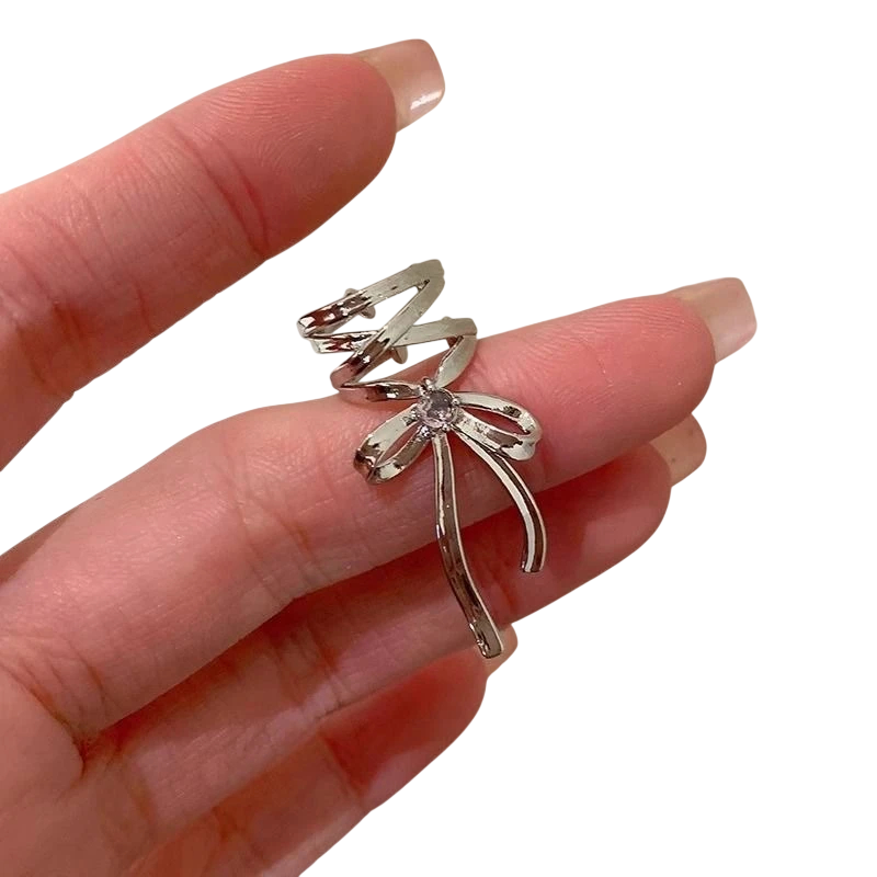 Elegante clip de oreja plateado en forma de lazo, ideal para el estilo Y2K. Pendientes de metal de moda para chicas y mujeres para cualquier fiesta. Descripción completa
