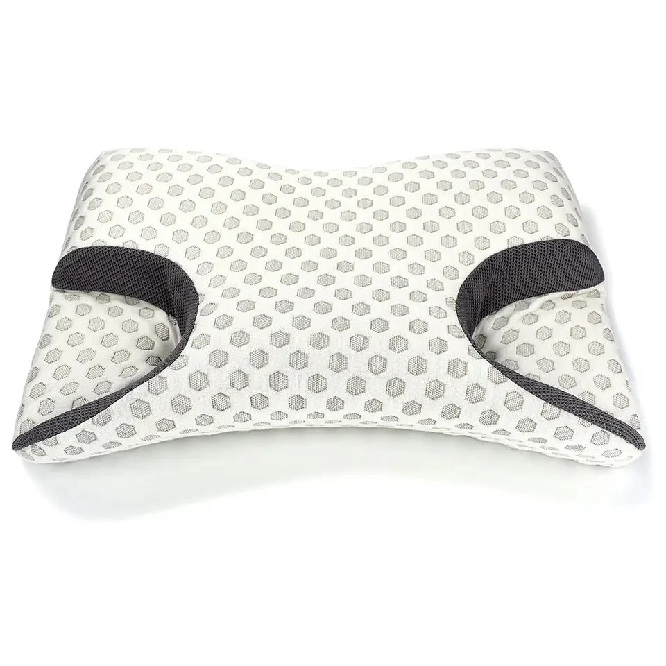 El cojín ergonómicamente moldeado está diseñado para personas que utilizan una máscara de respiración durante el sueño, por ejemplo, en el tratamiento de apnea del sueño. Los cortes laterales especiales ayudan a reducir la presión sobre la máscara y el tubo, lo que permite un sueño más cómodo de lado y de espaldas.