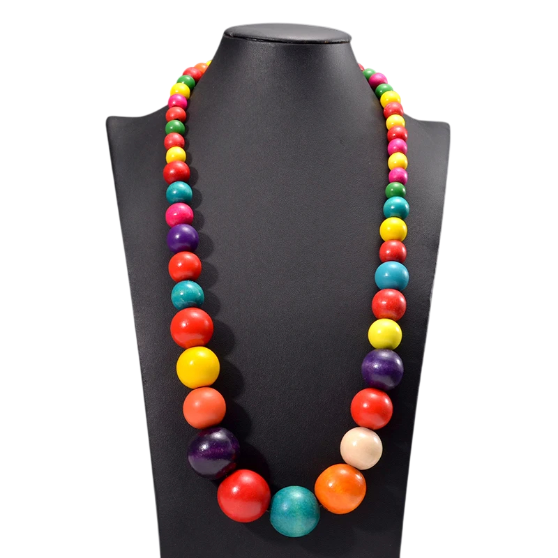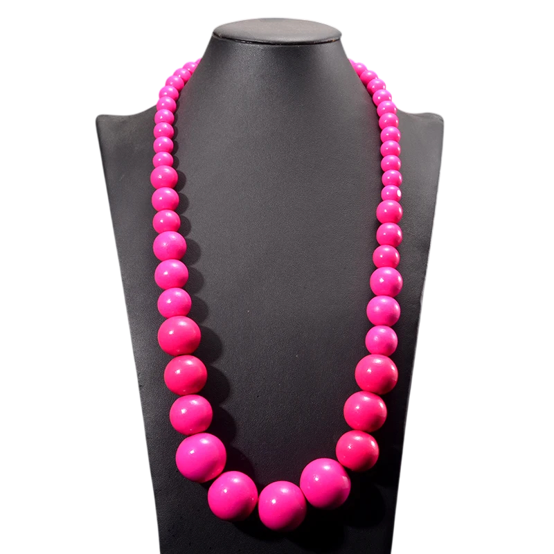 Collar de madera con cuentas redondas de varios tamaños. Longitud de 37 cm y color llamativo para complementar un atuendo cotidiano. Descripción completa