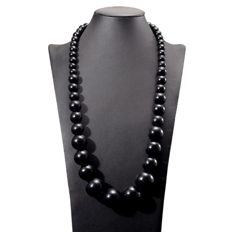 Las cuentas están hechas de madera y tienen una superficie lisa. El aumento gradual del tamaño hacia el centro crea un aspecto equilibrado. El collar tiene un diseño simple, pero al mismo tiempo es notable gracias al color y la forma de cada una de las cuentas.