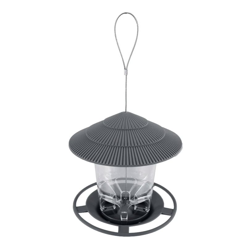 Comedero colgante para pájaros con techo y posadero, ideal para uso exterior en el jardín. Fácil de colgar gracias al cable de acero de 13,5 cm. Descripción completa
