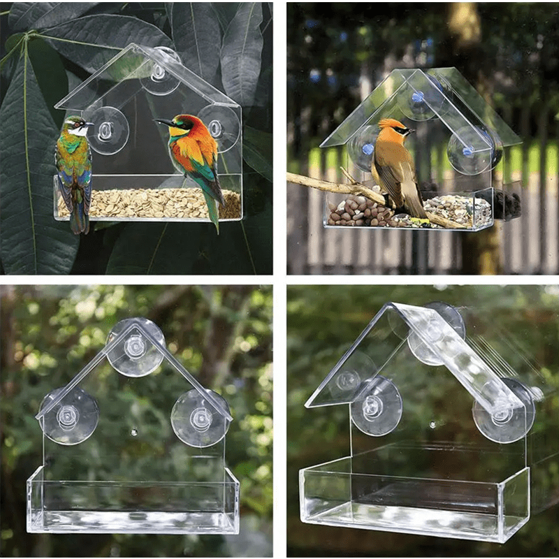 Práctico comedero transparente para ventana con ventosas permite observar aves de cerca. Instalación sencilla, adecuado para uso durante todo el año. Descripción completa
