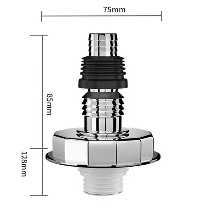 Este conector recto de desagüe de suelo para lavadora está diseñado para una conexión segura y eficiente de las mangueras de desagüe de la lavadora, lavavajillas o triturador de residuos directamente al desagüe del suelo. Gracias a su superficie cromada, el conector es resistente al desgaste y a la corrosión, asegurando una larga vida útil. El adaptador permite la conexión universal de mangueras de diferentes diámetros y soporta la descarga por gravedad, lo que garantiza un desagüe fiable de aguas residuales sin retorno.